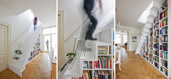 位于荷蘭阿姆斯特丹的marc koehler architects利用樓梯一層層的規(guī)則,分割出大小一致的方格,把樓梯下的三角空間充分利用成書架,不但可以收納更多書籍,而且剛好在餐桌前,面對(duì)一整面書墻用餐,不比盯著電視差喔。