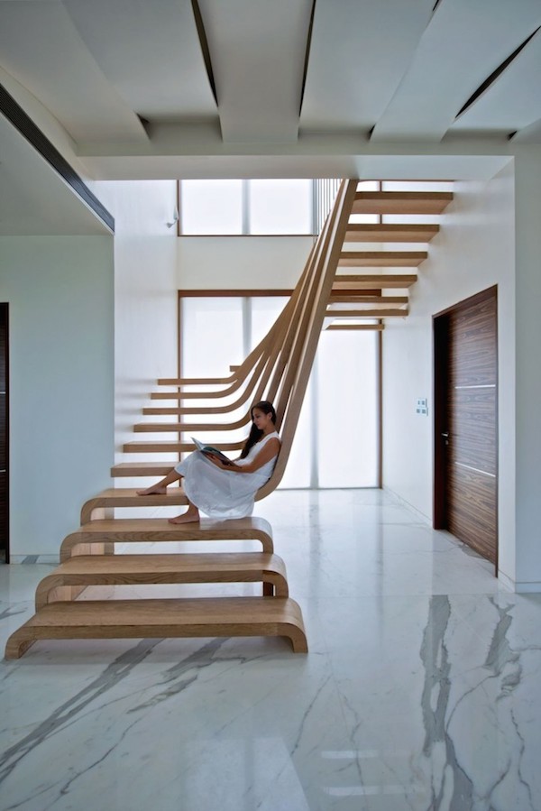 建筑師工作室Arquitectura en Movimento Workshop設(shè)計(jì)的樓梯,美輪美奐,少了扶手,卻多了連接上下梯面的木板,爬起來(lái)舒服,看起來(lái)也順眼,而且室內(nèi)的透光性更好,使用者可以隨意的坐在樓梯上,并且以延伸面做為椅背,圓弧的角度看起來(lái)十分舒適。